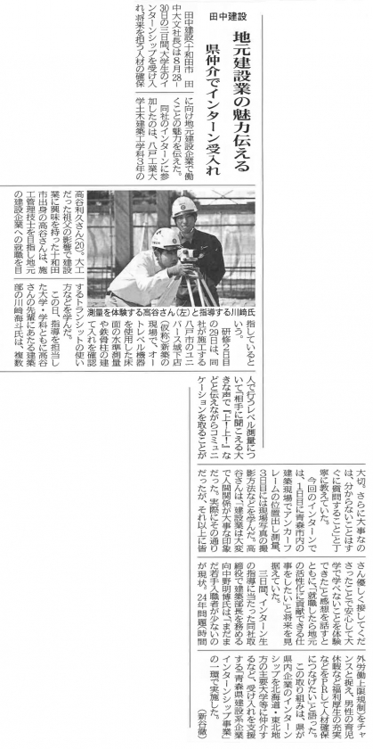 八戸工業大学生を迎えて、8月28日~30日の3日間実施したインターンシップの様子が、日刊建設青森に掲載されました。