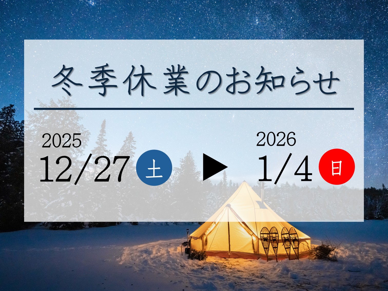 お知らせ(ニュース) 2025.12.12 冬季休業のお知らせ 拝啓 毎々格別のご愛顧を賜り、厚く御礼申し上げます。 弊社の冬季休業日についてご案内申し上げます。 お得意先各位には何かとご不便をおかけするものと存じますが、 何卒ご理解をいただきご協力賜りますようお願い申し上げます。 ◆ 冬季休業期間 ◆ 2025年12月27日(土)~ 2026年1月4日(日)※2026年1月5日(月)より通常業務とさせていただきます。 前のページに戻る